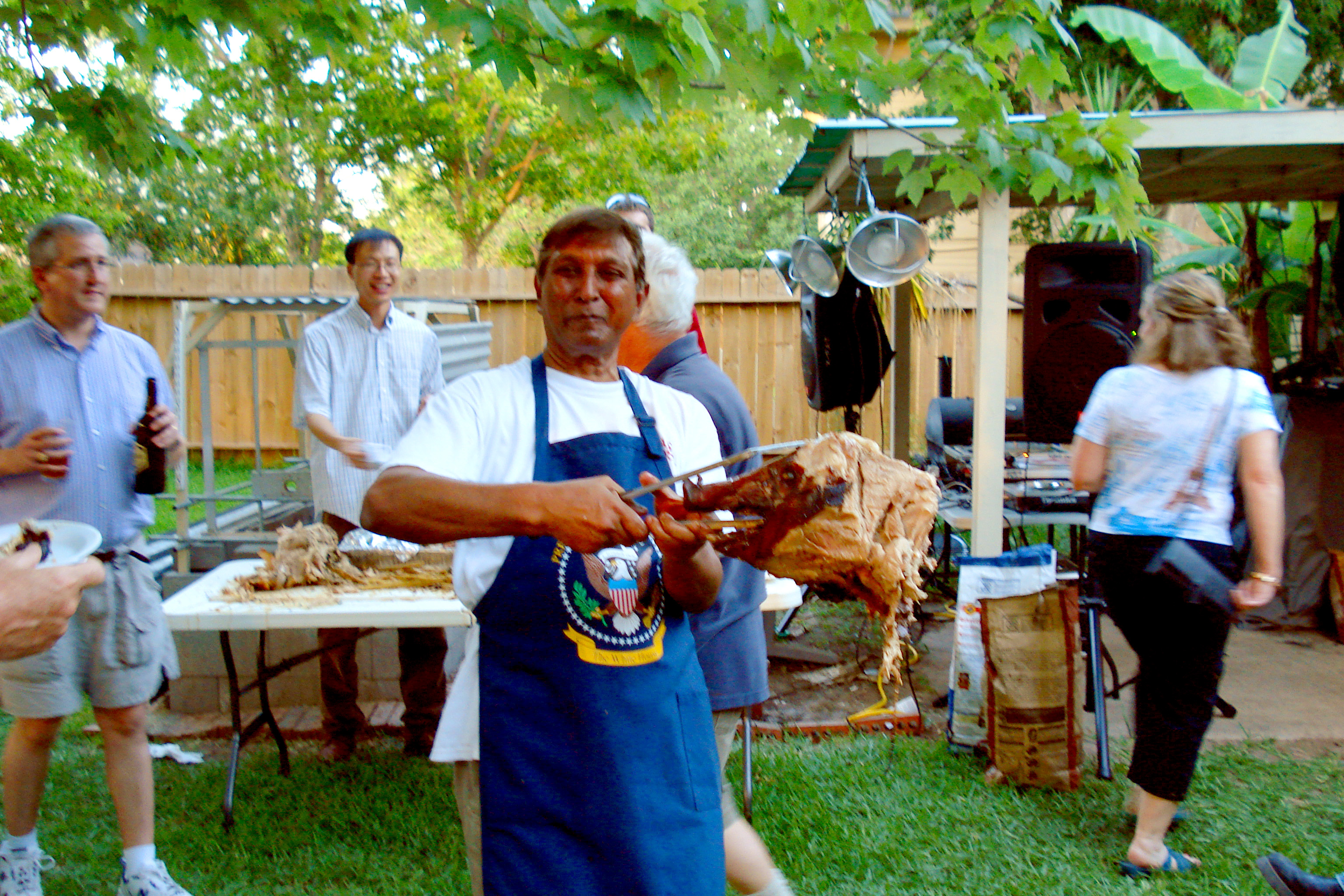 Dad posing with the head. BEHIND LEFT-TO-RIGHT: Jorge, Hongbiao, Brian, Mark, Barbara